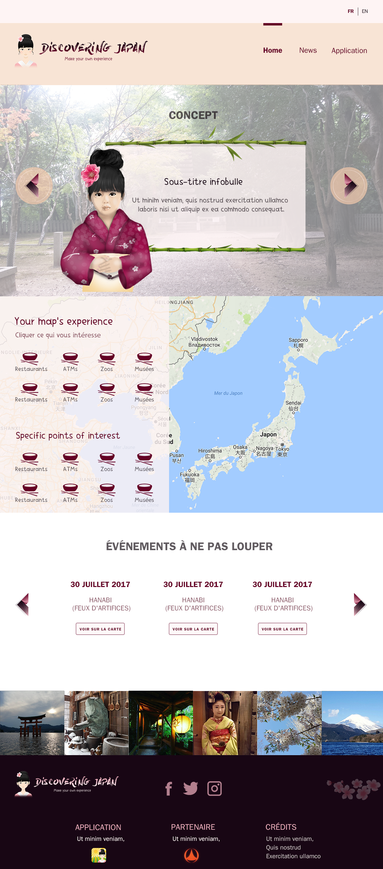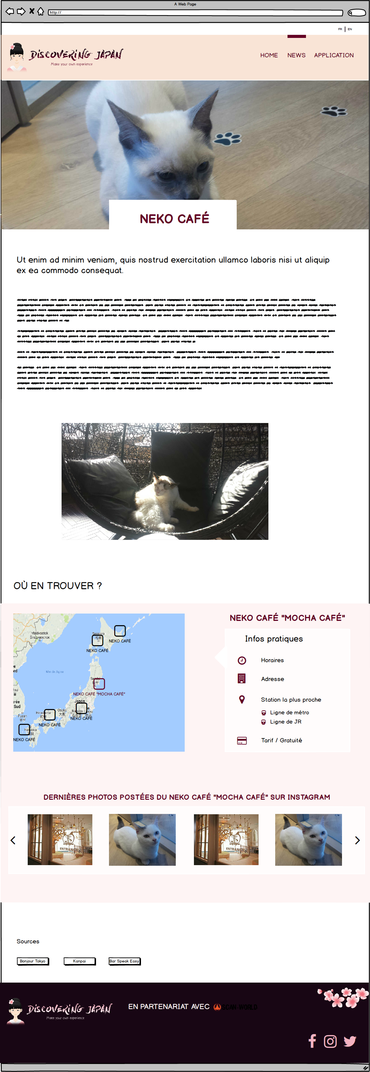 L’objectif principal est de pouvoir présenter un site fonctionnel développé avec WordPress. À long terme, Le site devra regrouper sur une carte des points d’intérêts basiques (restaurants, ATM…) et spécifiques (neko café, cérémonies de thé, onsen…) que l’utilisateur pourra consulter et choisir avec un système de checkbox.
